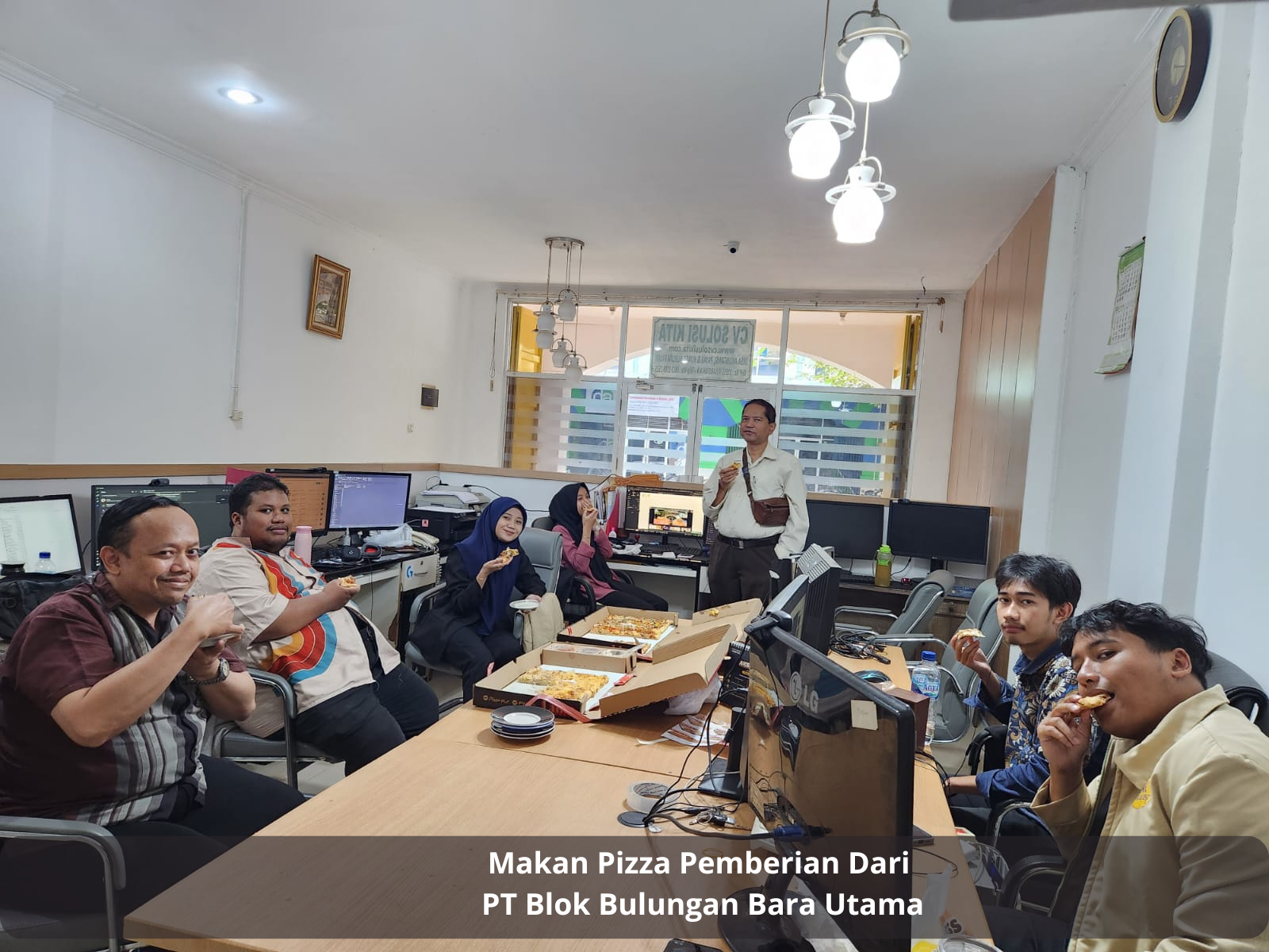 Momen kebersamaan CV Solusi Kita bersama PT Blok Bulungan Bara Utama – makan pizza sambil berdiskusi ringan mengenai perpajakan.
