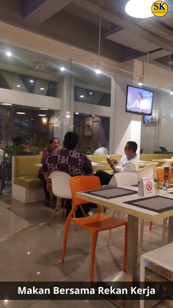 Foto ini menampilkan suasana makan bersama rekan kerja di sela aktivitas pekerjaan. Kebersamaan seperti ini tidak hanya memberikan waktu istirahat yang menyenangkan, tetapi juga menjadi sarana memperkuat kekompakan, membangun komunikasi yang lebih baik, serta meningkatkan semangat kerja di lingkungan profesional.