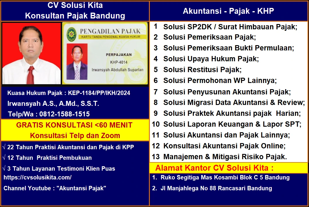 Brosur ini merangkum jenis layanan pajak dan akuntansi yang disediakan oleh CV Solusi Kita di Bandung. Tim kami berpengalaman dalam menangani kepatuhan, SP2DK, pemeriksaan, hingga rekonstruksi pembukuan untuk berbagai sektor usaha.