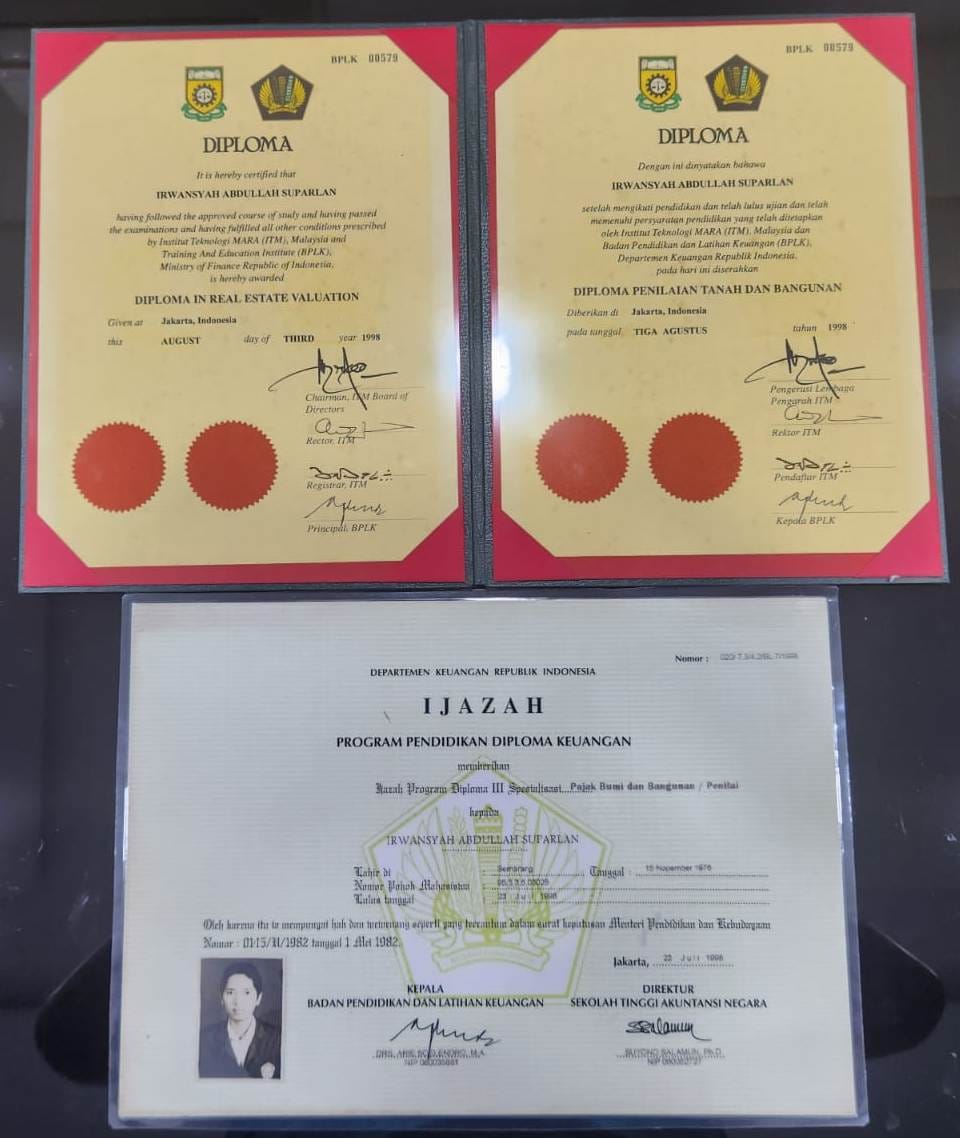Ijazah resmi program Diploma III Penilai Pajak Bumi dan Bangunan (PBB) yang diterbitkan melalui kerja sama antara BPLK Indonesia dan Institut Teknologi MARA (ITM). Dokumen ini dimiliki oleh Irwansyah A.S., pendiri dan konsultan pajak CV Solusi Kita Bandung, sebagai bukti kompetensi dan legalitas dalam bidang penilaian perpajakan.