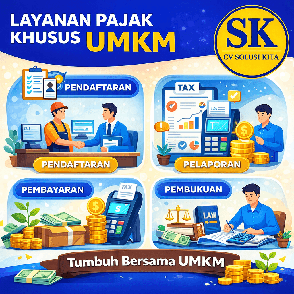 Ilustrasi layanan pajak khusus UMKM oleh CV Solusi Kita yang mencakup pendaftaran perpajakan, pelaporan SPT, pembayaran pajak, serta pembukuan usaha untuk membantu UMKM patuh pajak dan tumbuh berkelanjutan.