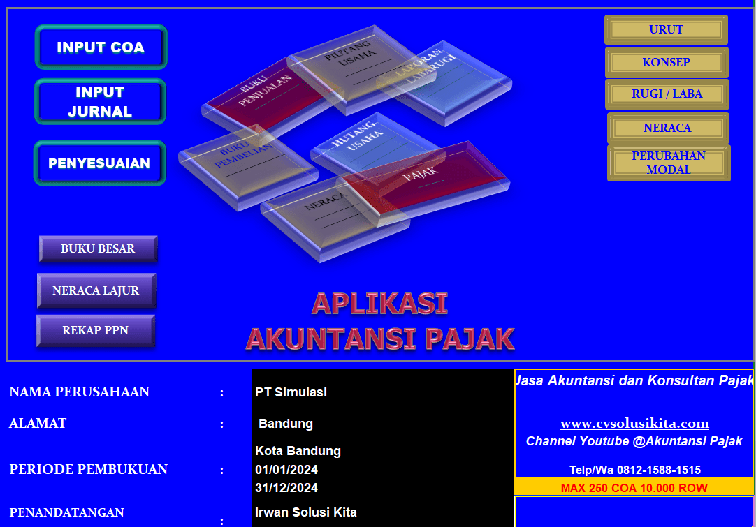 Aplikasi Akuntansi Excel CV Solusi Kita dirancang untuk usaha dagang B2B, dengan alur pembukuan yang defensible untuk SP2DK dan Pemeriksaan Pajak. Sistem mencakup satu siklus pembukuan mulai dari COA, jurnal, buku besar, neraca lajur 10 kolom, ekualisasi pajak, hingga laporan keuangan dan perpindahan saldo otomatis ke tahun berikutnya. Aplikasi ini digunakan dalam kelas praktik pembukuan CV Solusi Kita dan terintegrasi dengan Portal CV Solusi Kita (web basis).