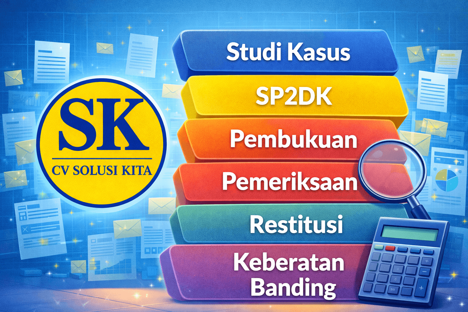 Gambar ini merepresentasikan rangkaian studi kasus pajak yang ditangani oleh CV Solusi Kita, mulai dari klarifikasi SP2DK, penyusunan dan rekonstruksi pembukuan, pendampingan pemeriksaan pajak, proses restitusi pajak, hingga pengajuan banding pajak. Setiap kasus ditangani dengan pendekatan profesional, berbasis data dan ketentuan perpajakan, untuk memberikan kepastian hukum dan solusi yang proporsional bagi Wajib Pajak.